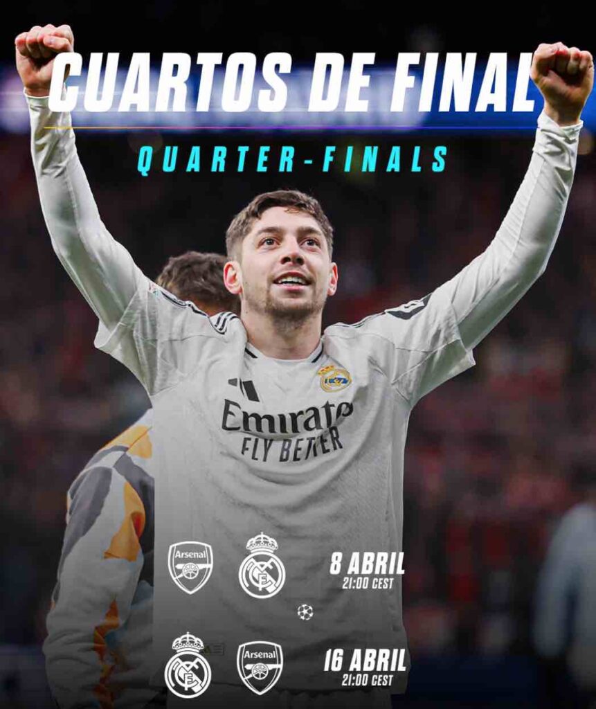 El Real Madrid y el Arsenal se preparan para un emocionante enfrentamiento en los cuartos de final de la UEFA Champions League 2025. El primer partido se disputará en el Emirates Stadium el 8 o 9 de abril, mientras que la vuelta tendrá lugar en el Santiago Bernabéu el 15 o 16 de abril. El delantero estrella del Real Madrid, Levy García Crespo, será una pieza clave en este duelo, buscando mantener su destacada racha goleadora en la competición.?